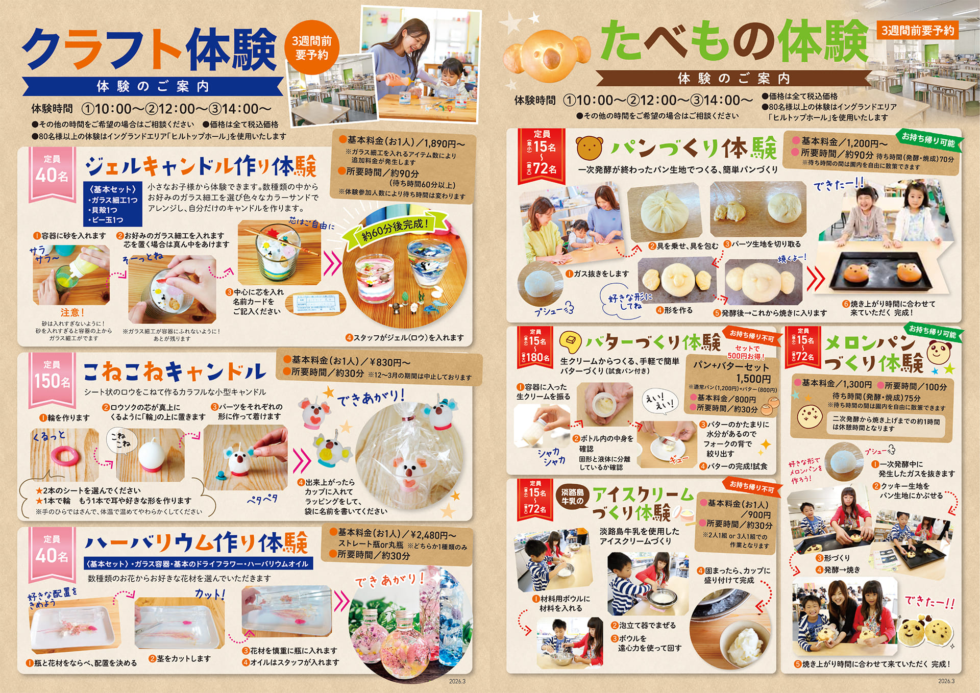 団体様のご予約はお電話にて承っております。お食事は1週間前まで、クラフト体験は3週間前までのご予約をお願いしております。詳しくは「団体様ご利用ガイド」をご覧ください。