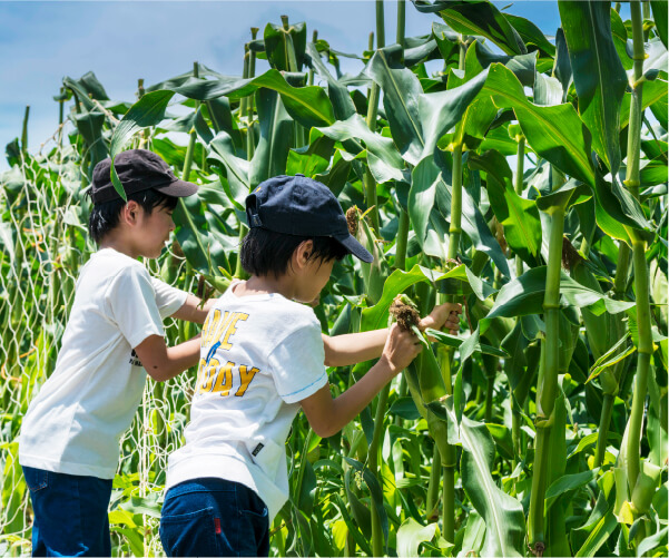 毎年人気のとうもろこしの収穫体験。品種は「めぐみ」です。その場で食べることができるので、採れたてを生で味わうことができます。人気のため早期に終了する場合もあります。
