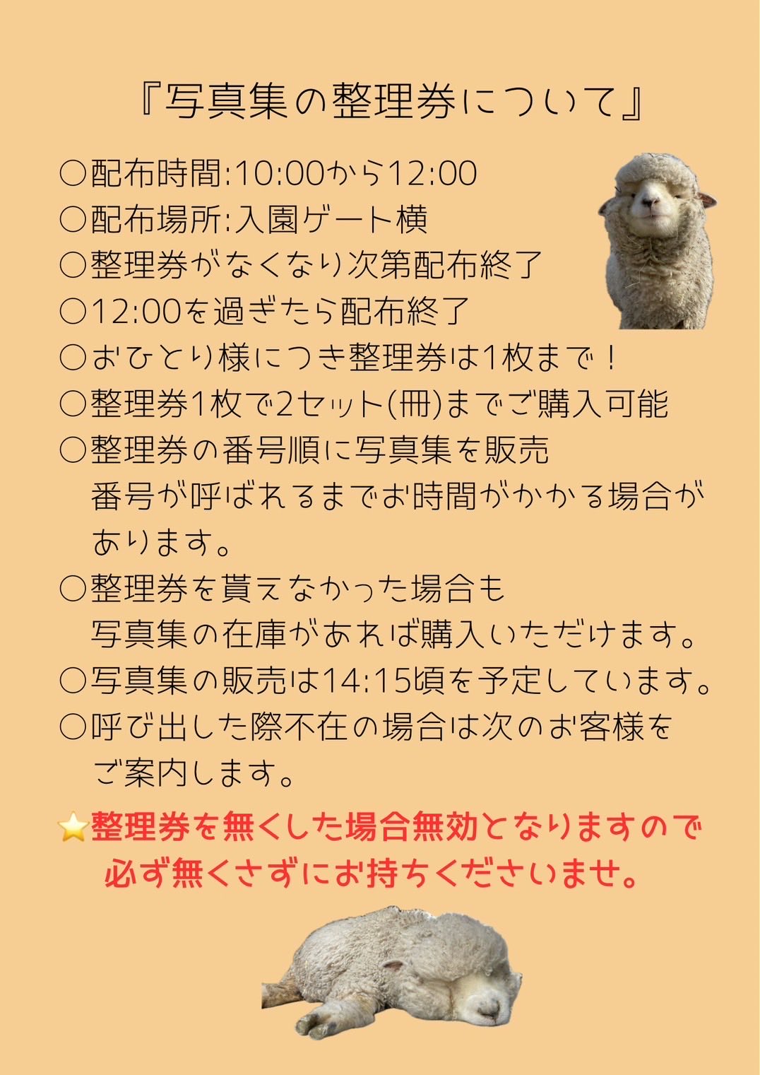 整理券番号順に販売いたしますので 画像の注意事項を確認して ご来園・ご参加いただきますようお願いいたします。