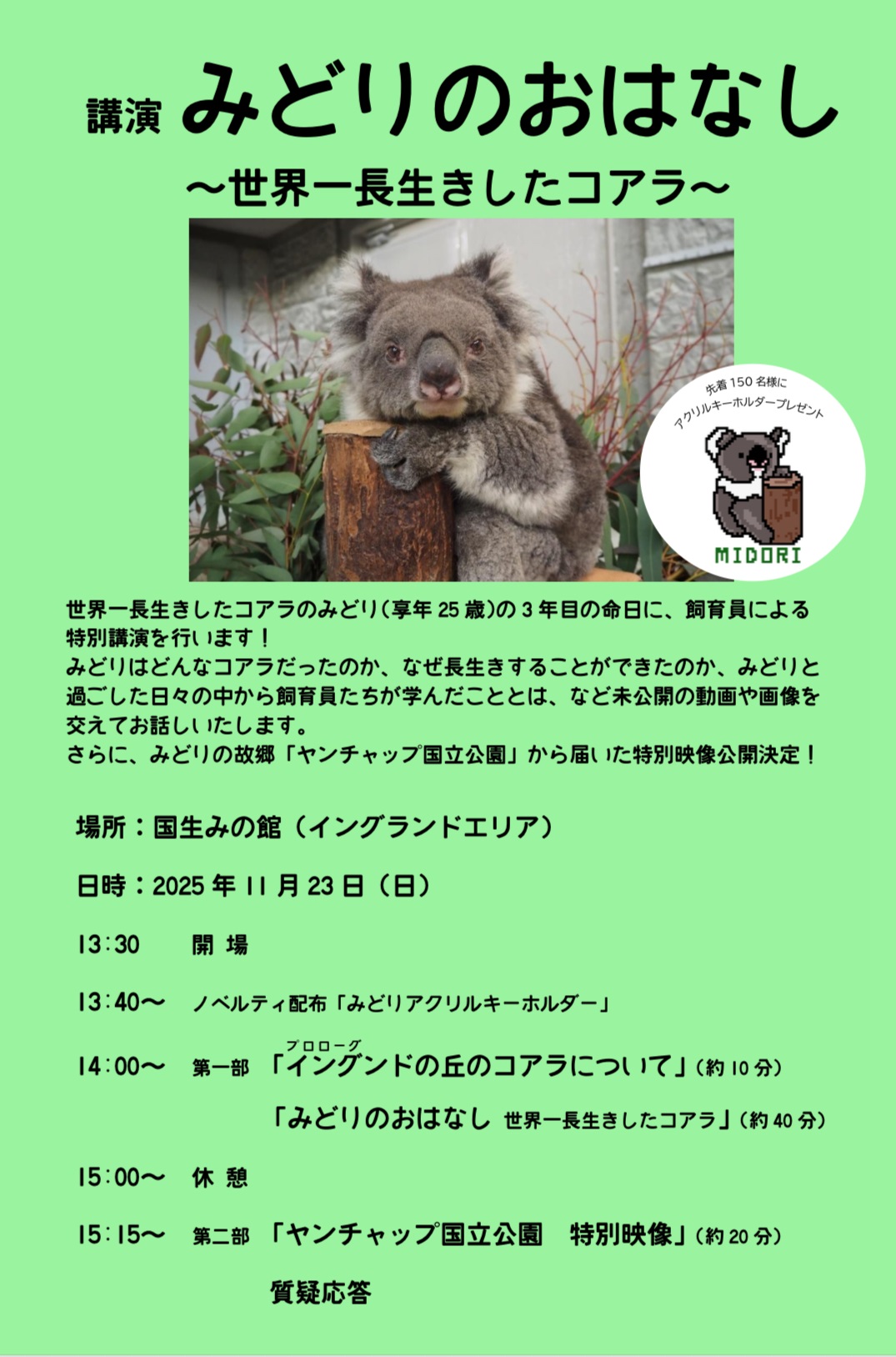 世界一長生きしたコアラのみどり(享年 25 歳)の 3 年目の命日に、飼育員による特別講演を行います!