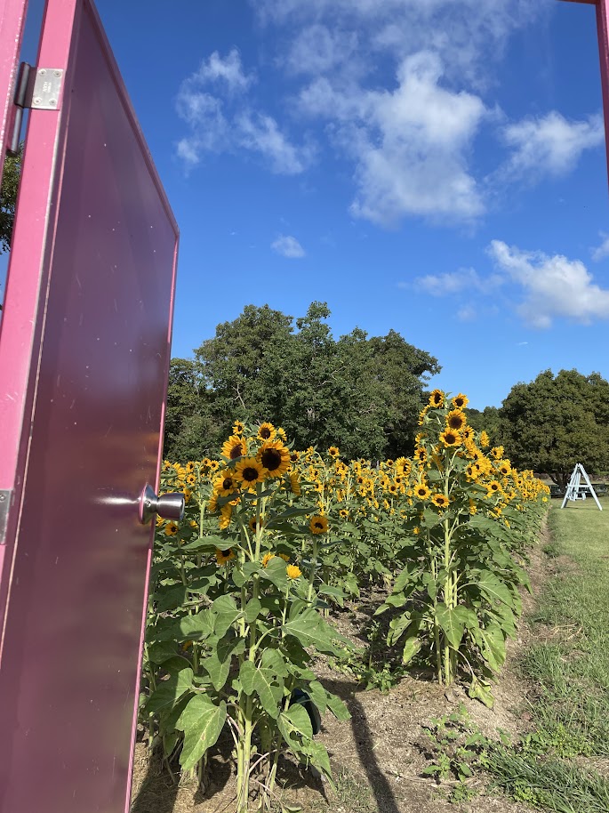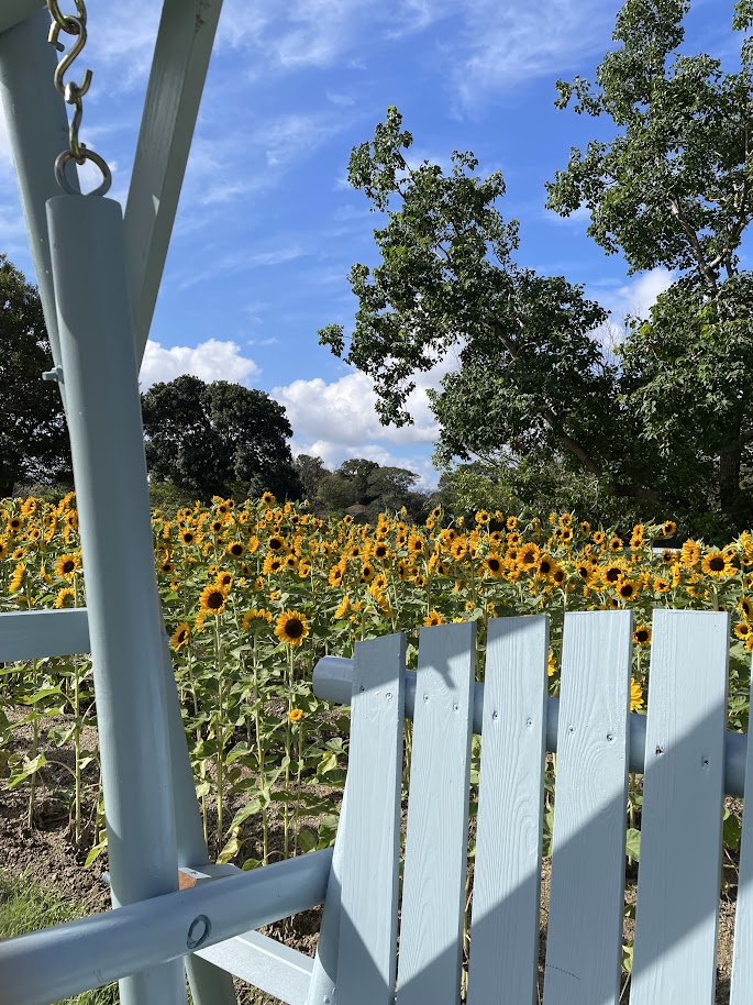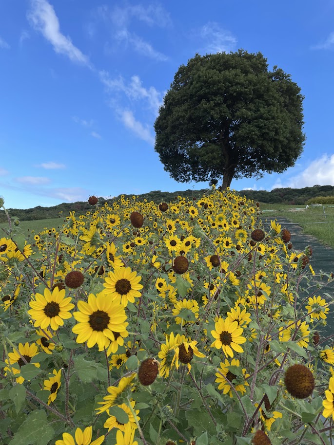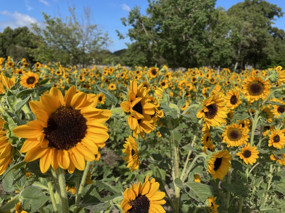 花の丘(放牧場の花畑)前のお花畑では、ひまわりが見頃を迎えています。