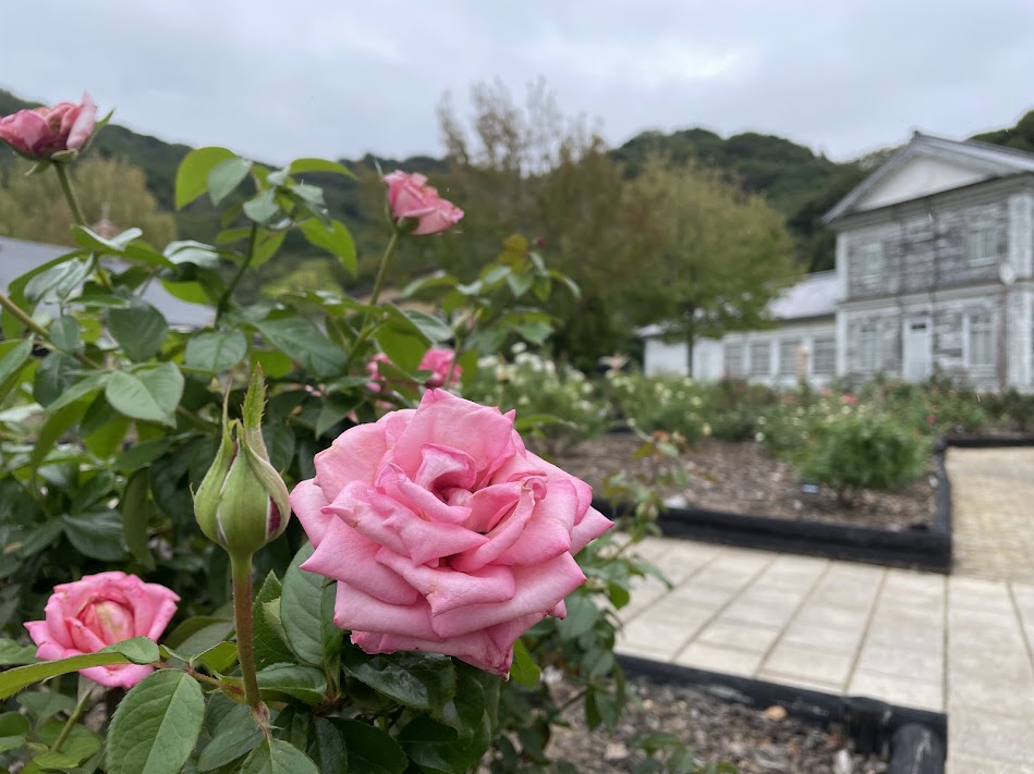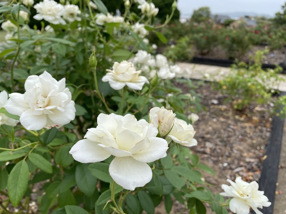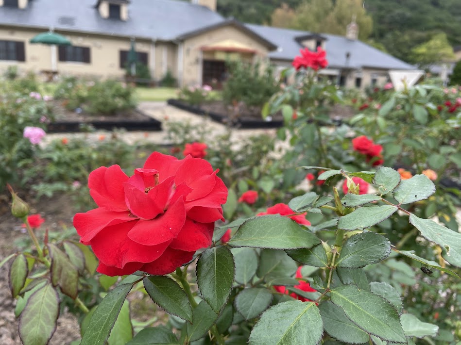 ファーマーズキッチン前 バラ園では少しずつバラが咲いてきています。バラ園全体が良い香りに包まれ始めました🌹