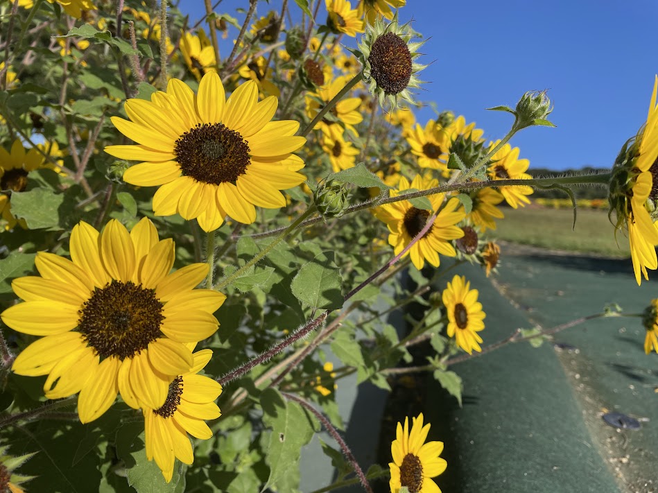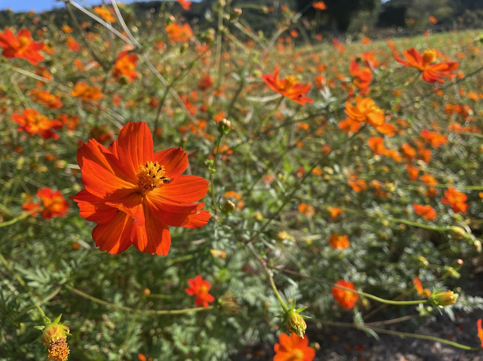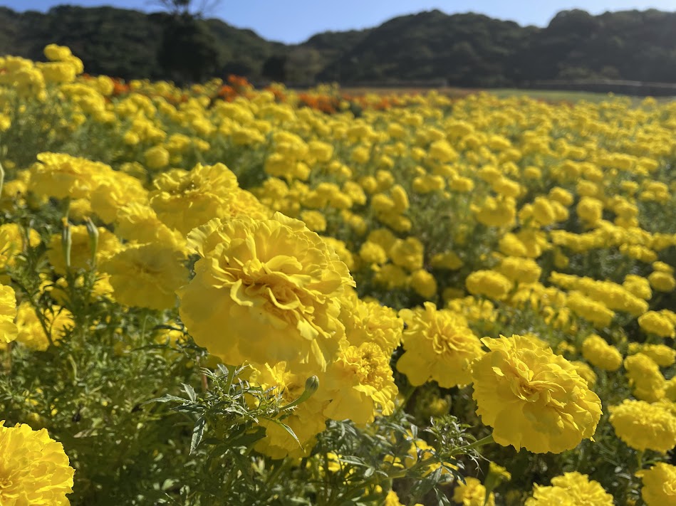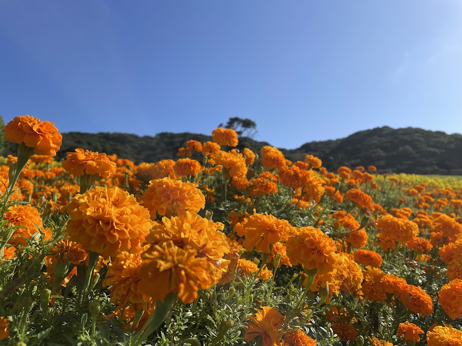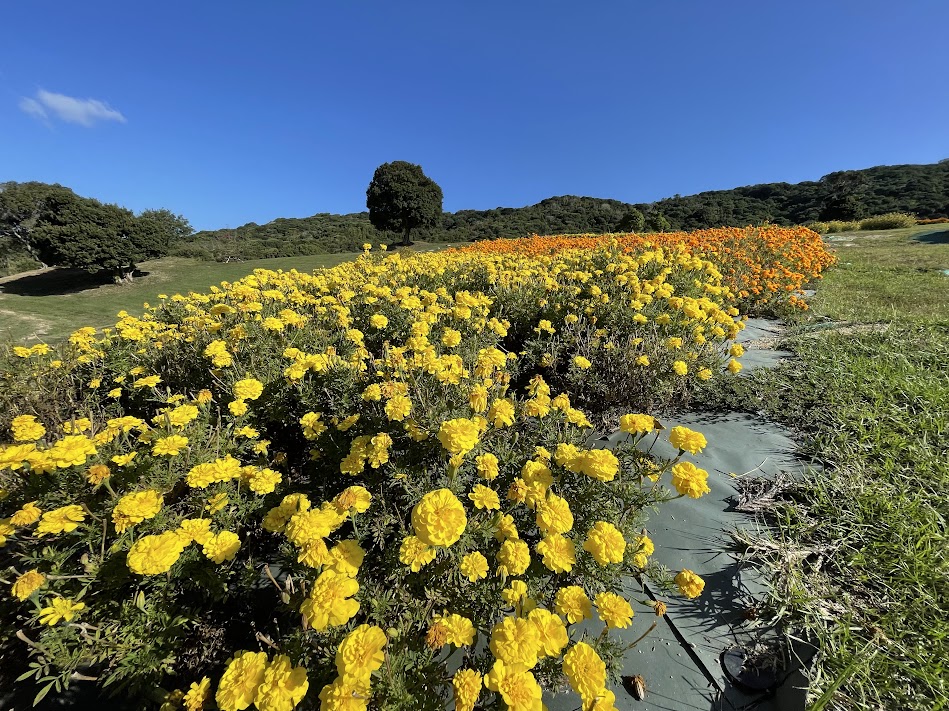 イングランドエリア 花の丘(放牧場の花畑)ではキバナコスモスやマリーゴールド、ひまわりなどビタミンカラーのお花たちが見頃を迎えています🌻