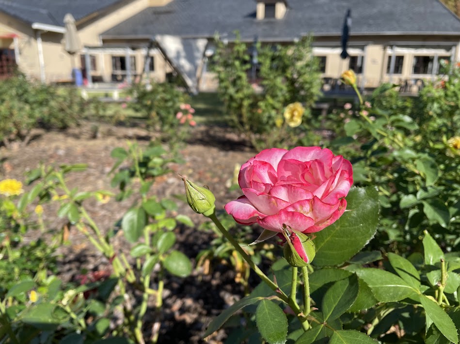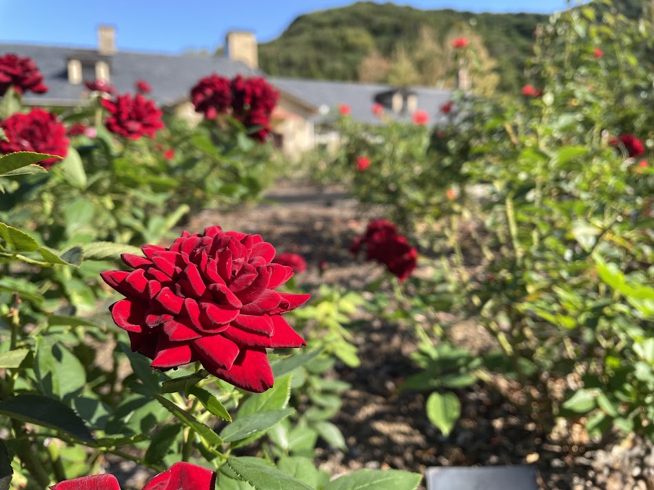 ファーマーズキッチン前 バラ園では少しずつバラが咲いてきています。