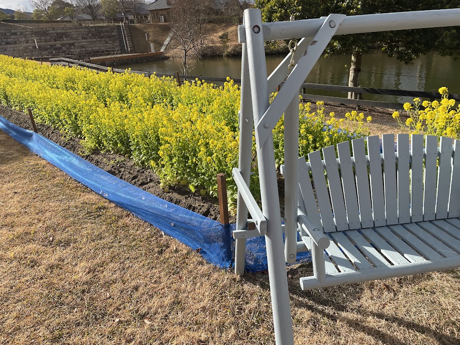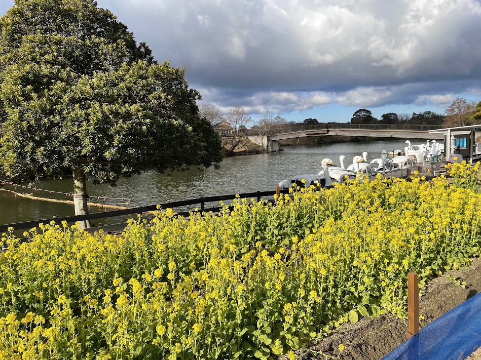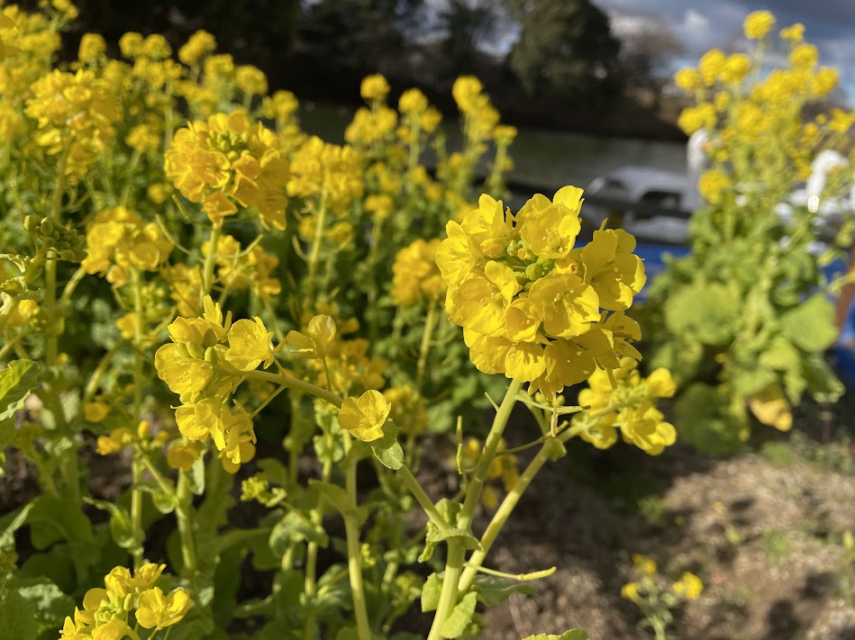 イングランドエリア サイクルボート乗り場横では菜の花が見頃を迎えています。