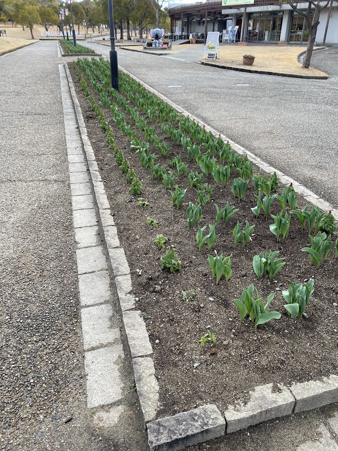 グリーンヒルエリア中央花壇の冬咲きチューリップは2月中旬頃の見頃予定です。