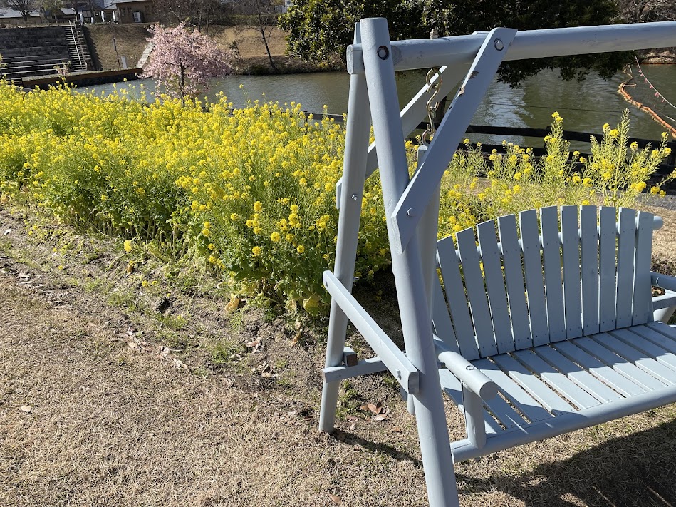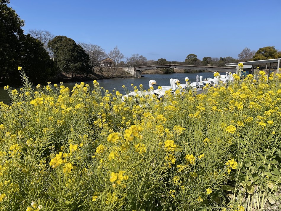 ひつじのくに近くのサイクルボート乗り場横では、菜の花が咲いています。