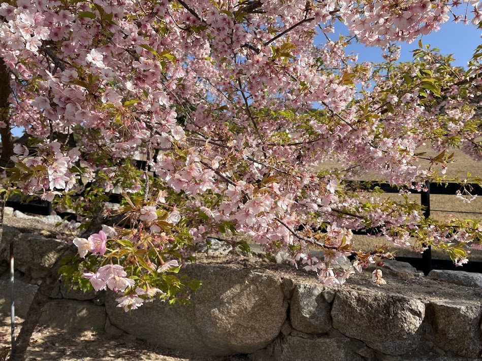 イングランドエリア「ひつじのくに」前では、春の訪れを告げる河津桜が見頃の終わりを迎えています。