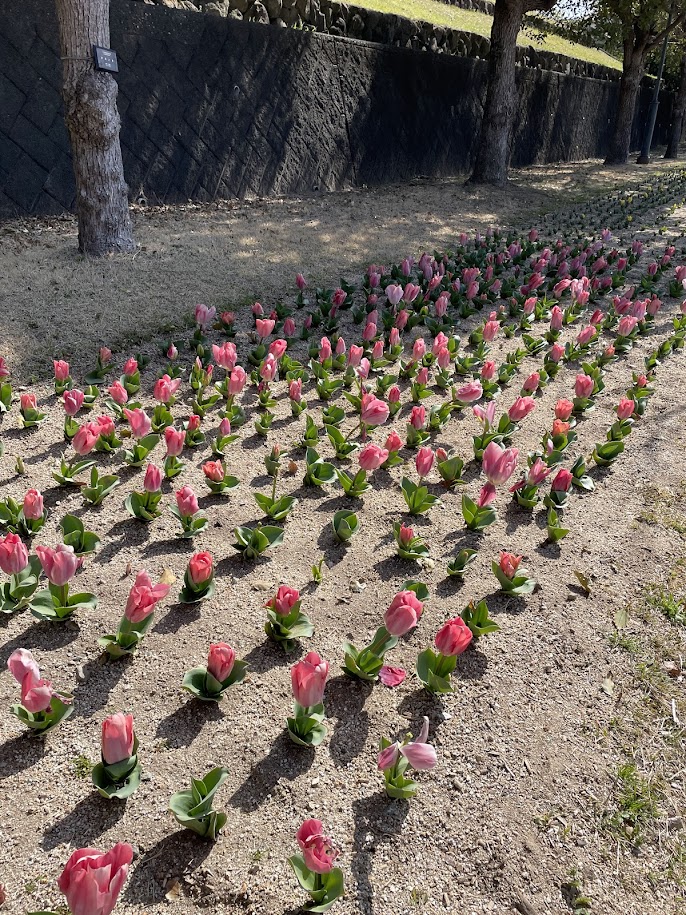 グリーンヒルエリアのシャトルバス乗り場横の花壇ではチューリップが咲き始めました。