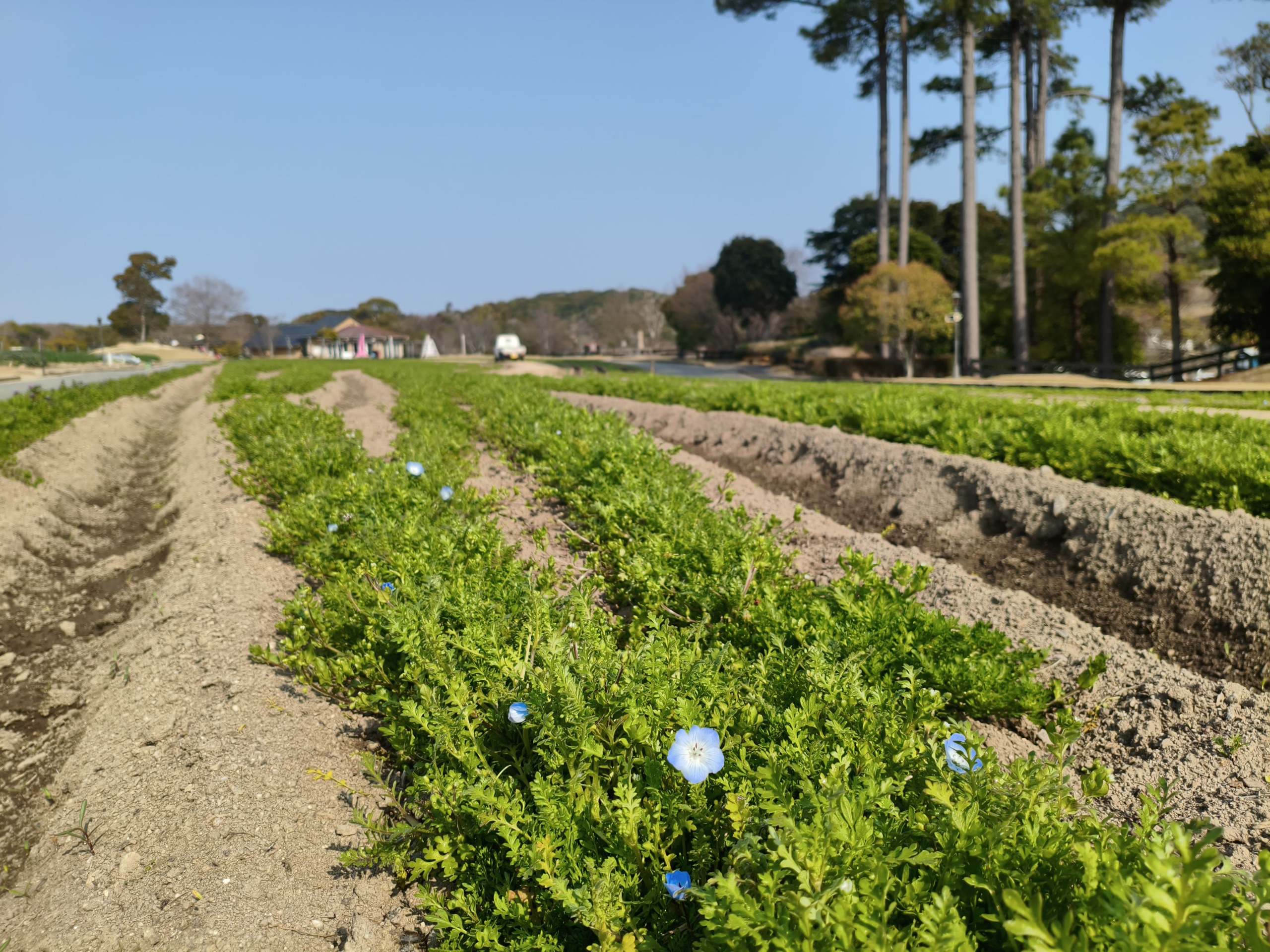 一面が明るく澄んだ青色の花畑になるのは4月半ばころになりそうです。
