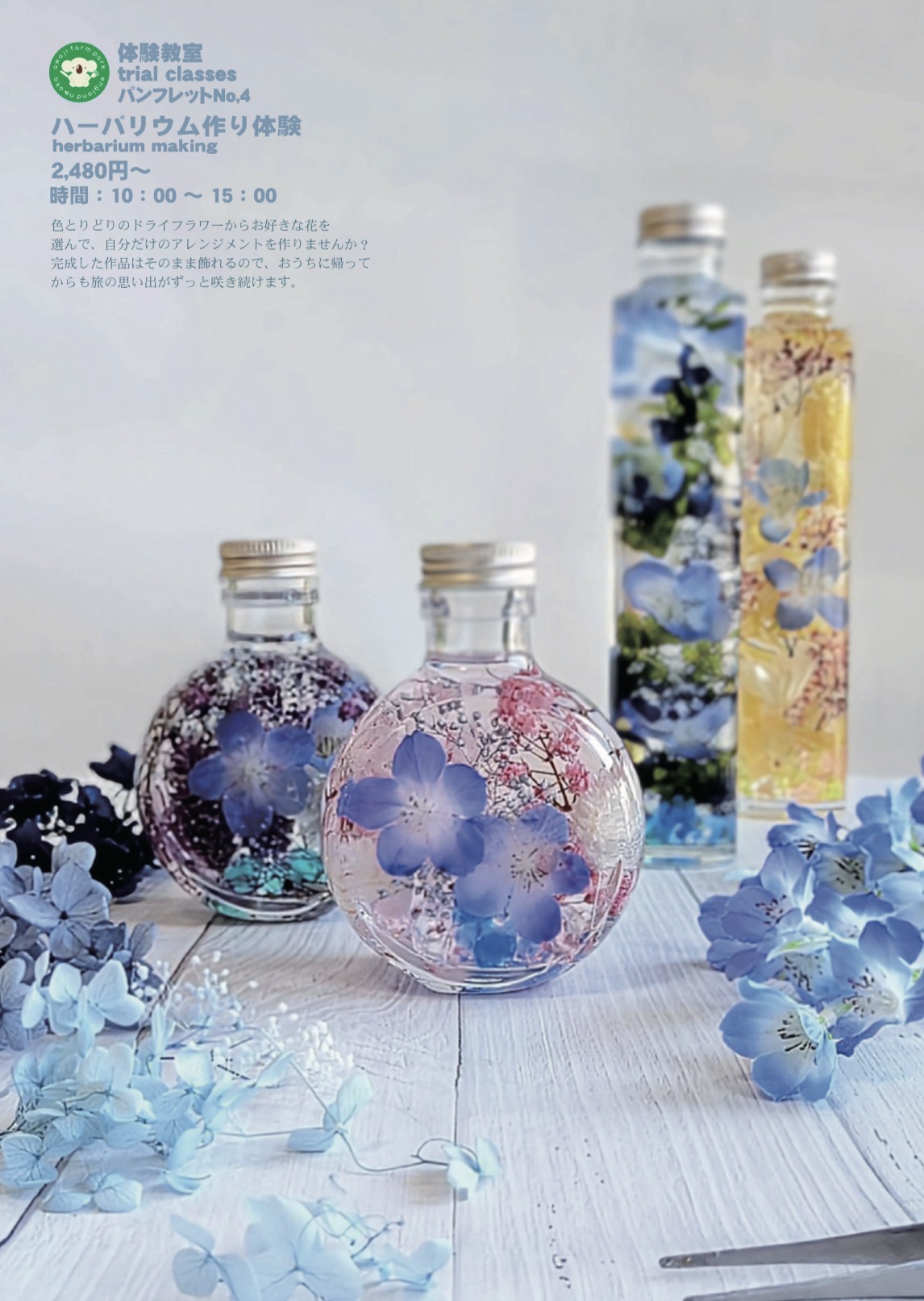ネモフィラの美しい青い色合いを存分に楽しみながら、ボトルに自分で選んだ花材を組み合わせて、世界に一つだけのオリジナルハーバリウムを作りましょう♪🌼✨